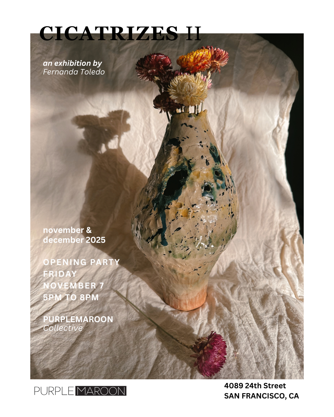 CICATRIZES a transfiguration of marks a transfiguration of marks a transfiguration of marks CICATRIZES II NOVEMBER & DECEMBER 2025OPENING PARTYFRIDAYNOVEMBER 75PM TO 8PMPURPLEMAROON COLLECTIVE’S STORE 4089 24TH STREET SAN FRANCISCO, CA GALLERY